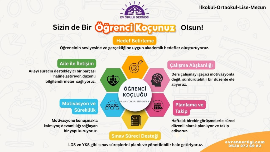 Öğrencilerin akademik ve psikolojik süreçlerinin bütüncül olarak ele alınması, öğrenme alışkanlıklarının yapılandırılması ve olası akademik ya da duygusal zorlanmaların erken dönemde fark edilmesi, Ev Okulu Derneği olarak önemle üzerinde durduğumuz bir yaklaşımdır. Bu doğrultuda yapılandırılan Öğrenci Koçluğu sistemimizi; sahada edinilen deneyimler, farklı yaş gruplarıyla yürütülen çalışmalar ve güncellenen içeriklerle birlikte sizlerle buluşturmanın heyecanını yaşamaktayız.